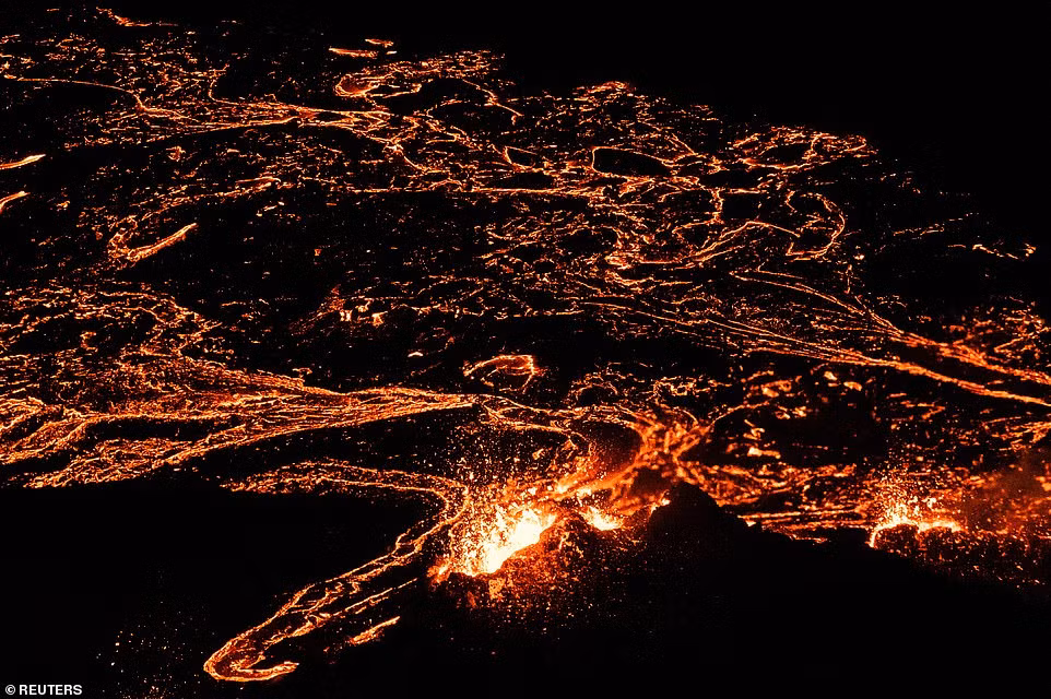 Núi lửa Fagradalsfjall bắt đầu phun trào vào khoảng 21h ngày 19/3, thắp sáng bầu trời đêm với luồng sáng đỏ rực.