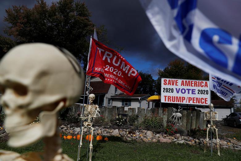 Căn hộ của cử tri Maranda Joseph ở Warren (bang Ohio) được trang hoàng dịp Halloween với những bộ xương khô cầm biểu ngữ ủng hộ ông Trump.