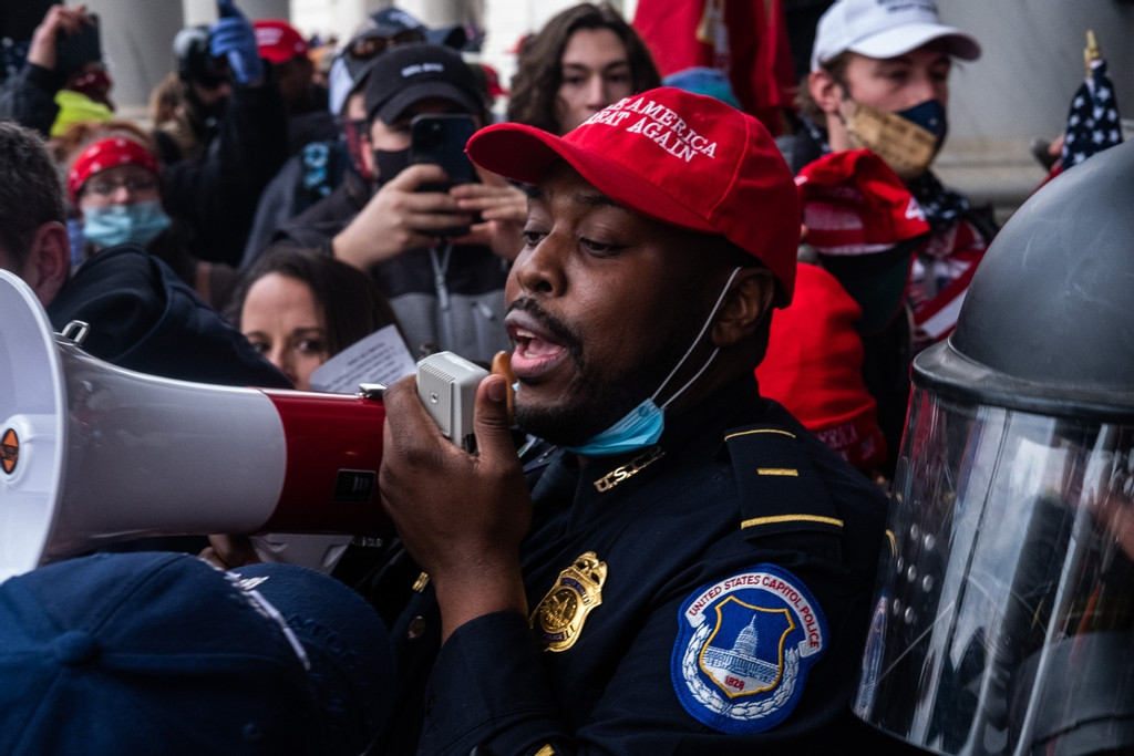 Cựu binh thủy quân lục chiến Chris Jones – người chụp bức ảnh – cho biết sĩ quan nói trên đội chiếc mũ lưỡi trai đỏ để “đánh lạc hướng đám đông” đang lao về phía một cánh cửa mở của Điện Capitol. Động thái này dường như là nhằm “câu giờ” để các đồng nghiệp kịp thời phong tỏa lối vào.