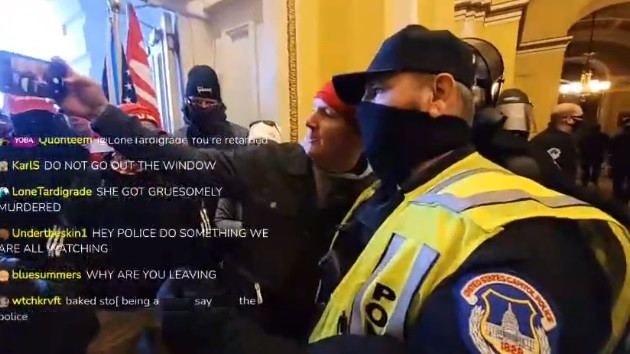 Danh tính những sĩ quan bị đình chỉ không được tiết lộ. Nhưng trên mạng xã hội đã xuất hiện hình ảnh một sĩ quan cảnh sát đội chiếc mũ màu đỏ đặc trưng của những người ủng hộ ông Trump, và cầm loa phát biểu trước đám đông.