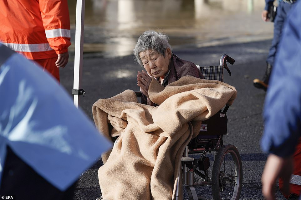Một cụ bà cảm ơn khi được lực lượng cứu hộ sơ tán khỏi nhà dưỡng lão. Ảnh: EPA