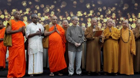 Cựu Thủ tướng Malaysia, ông Tun Abdullah Ahmad Badawi (giữa) cùng các thành viên của Hội Phật giáo trẻ Malaysia cùng cầu nguyện ở Kuala Lumpur