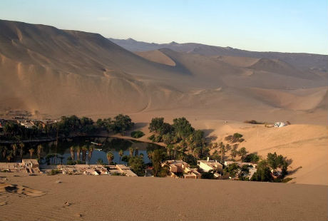 Ốc đảo Huacachina nằm cách thành phố Ica 8km thuộc tỉnh Ica, phía tây nam Peru, được xây dựng xung quanh một hồ nước tự nhiên trong sa mạc, bao quanh bởi những đụn cát khổng lồ cao vài trăm mét.