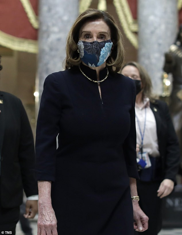 Đến phiên bỏ phiếu luận tội lần 2, ngày 13/1, chiếc váy xanh tím than được bà Pelosi diện một lần nữa, với chiếc vòng vàng y hệt.