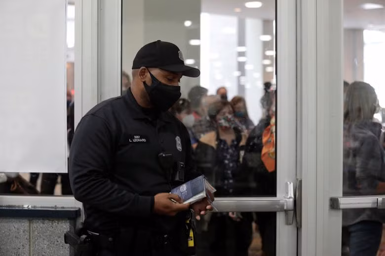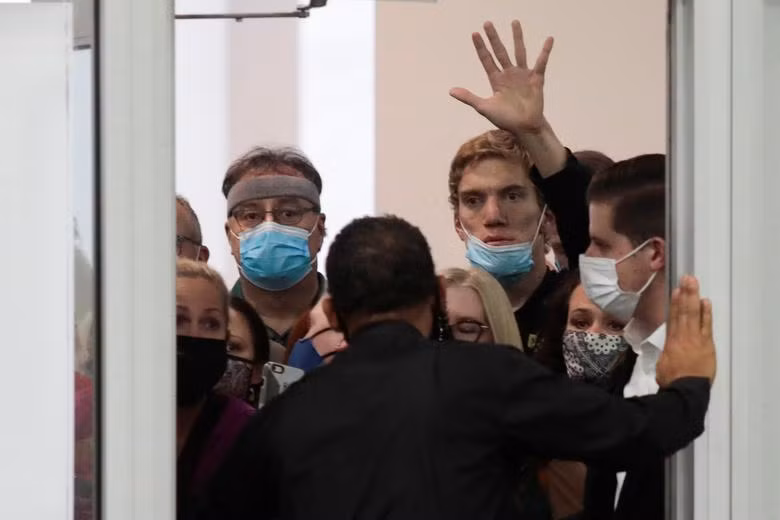 Những người này không được phép vào tòa nhà do các lệnh hạn chế phòng COVID-19.