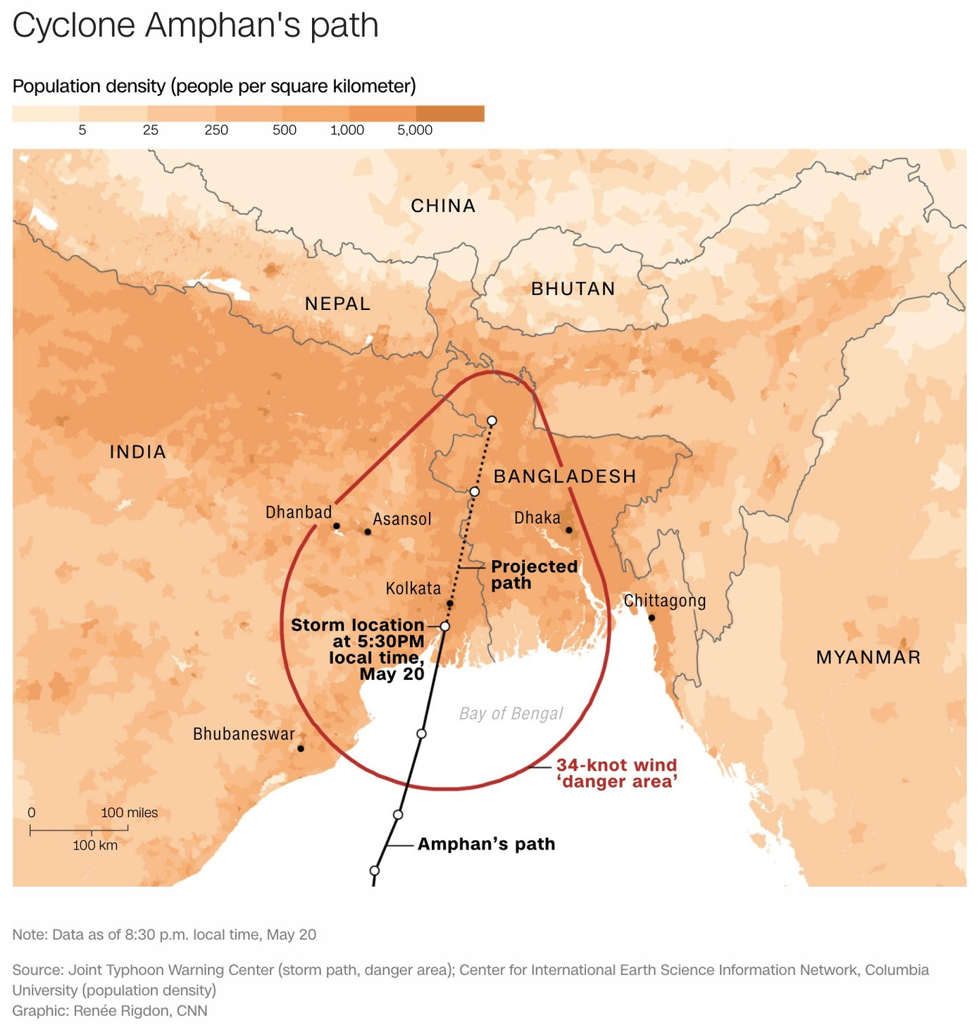 Theo CNN, bão Amphan đổ bộ bang Tây Bengal (Ấn Độ), khu vực giáp biên giới Bangladesh lúc 17h ngày 20/5, với sức gió 160km/h.