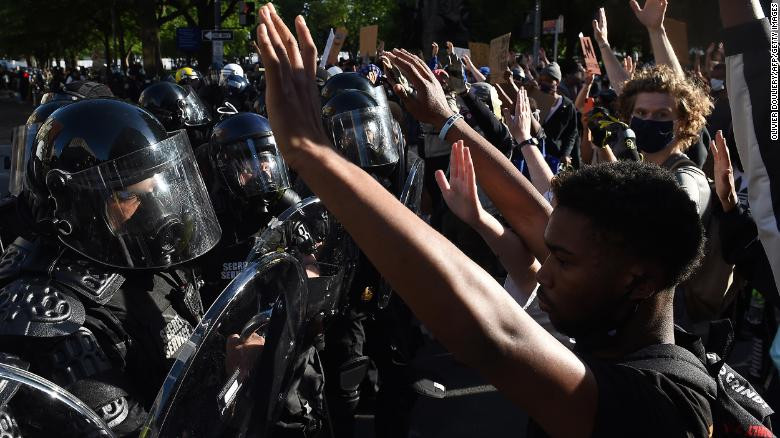 Một người biểu tình giơ biển "Bằng mọi biện pháp cần thiết" đứng trước cảnh sát ở thủ đô Washington ngày 30/5. Ảnh: USA Today.