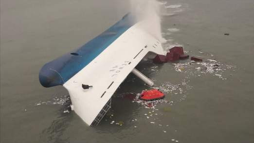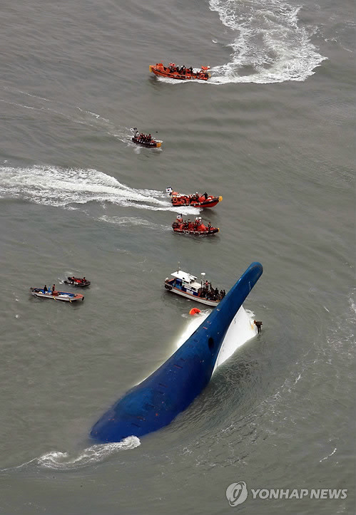 Con tàu bị nghiêng sang hẳn một bên rồi sau đó lật úp và chìm dần xuống mặt biển. Hiện sau hơn 5 giờ gặp nạn, chính phủ Hàn Quốc xác nhận 95% thân tàu đã bị ngập nước. Ảnh: Yonhap