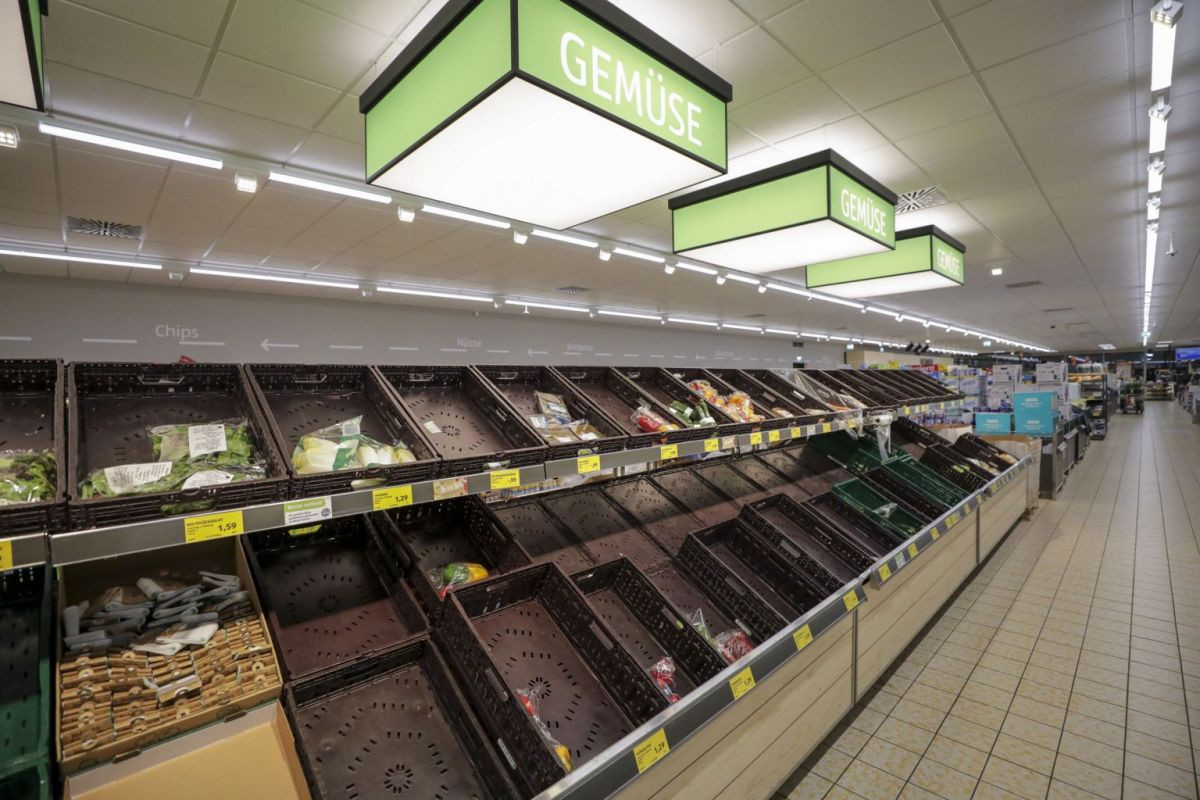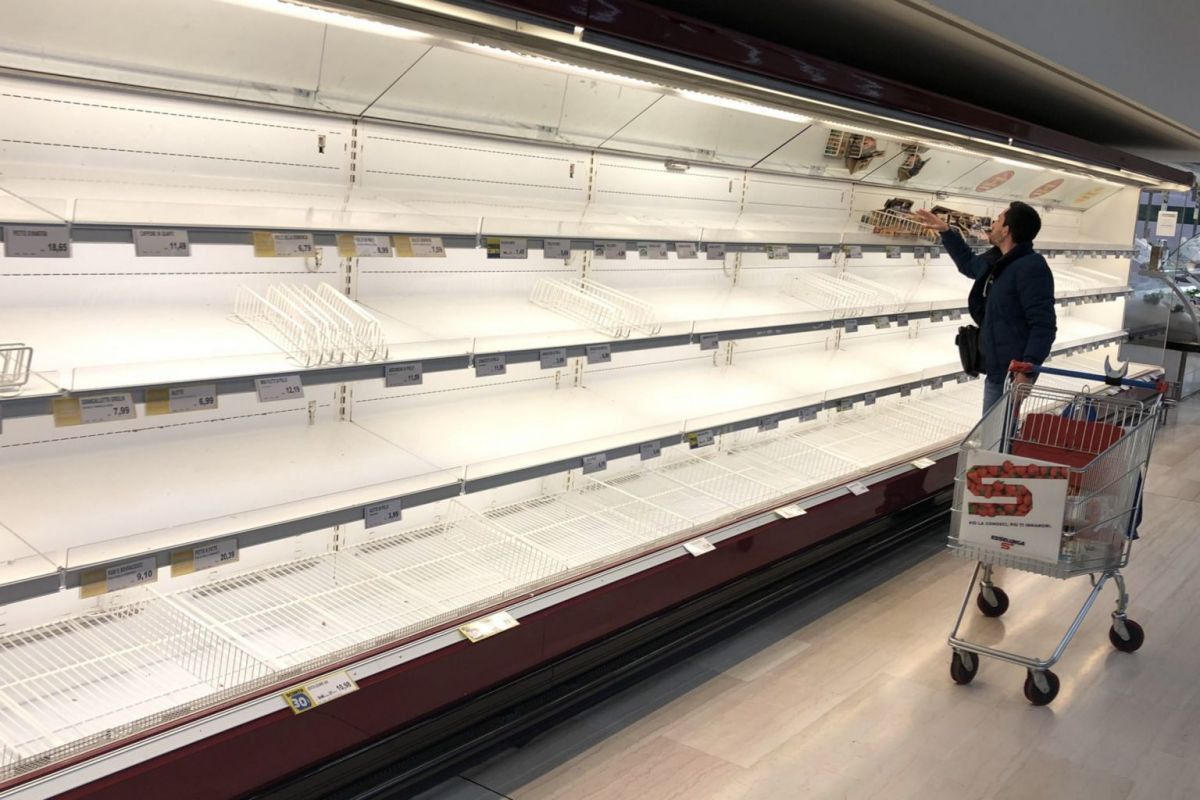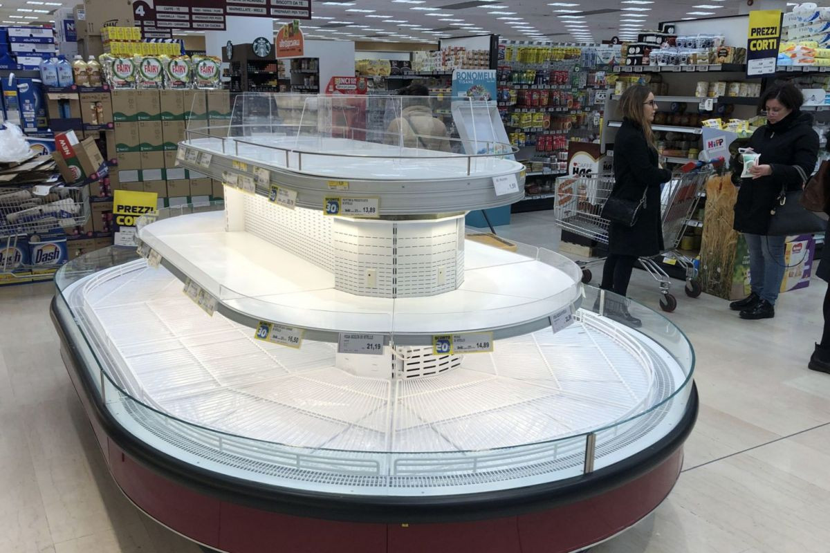Một siêu thị ở Pioltello, gần Milan (Ý) khan hiếm hàng hoá vì người dân đồng loạt tích trữ nhu yếu phẩm. Ảnh chụp ngày 24/2. Ảnh: EPA-EFE