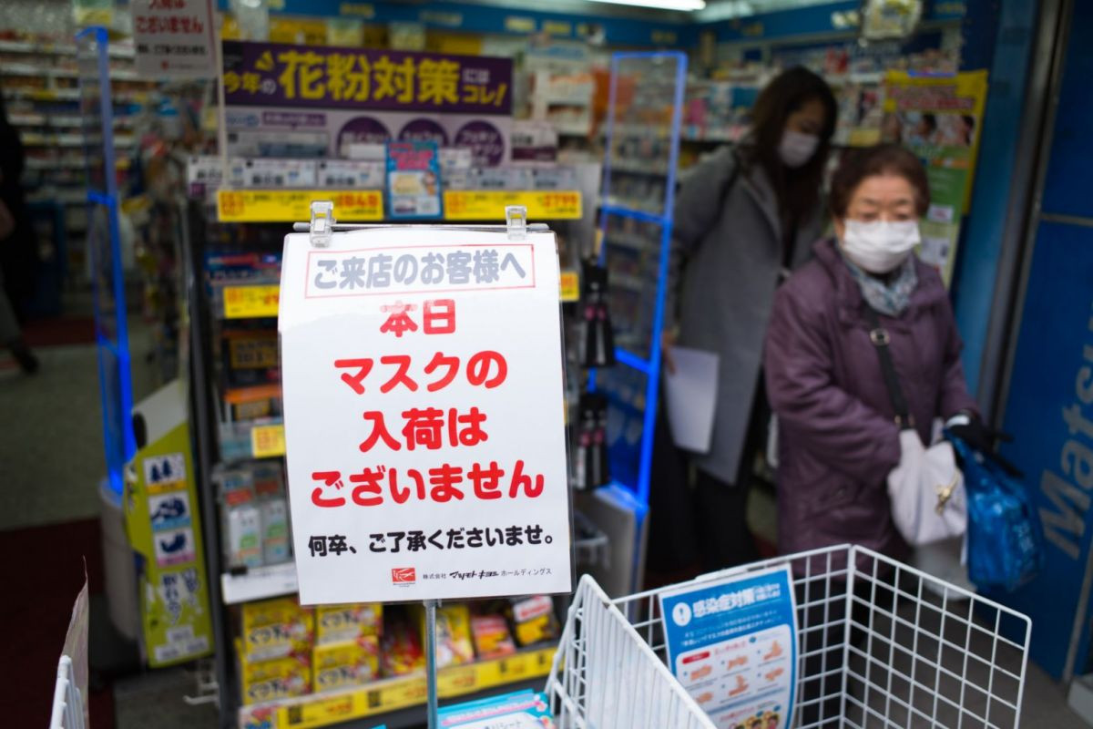 Bảng thông báo hết khẩu trang tại một hiệu thuốc ở Tokyo (Nhật Bản). Ảnh chụp ngày 28/2. Ảnh: Bloomberg