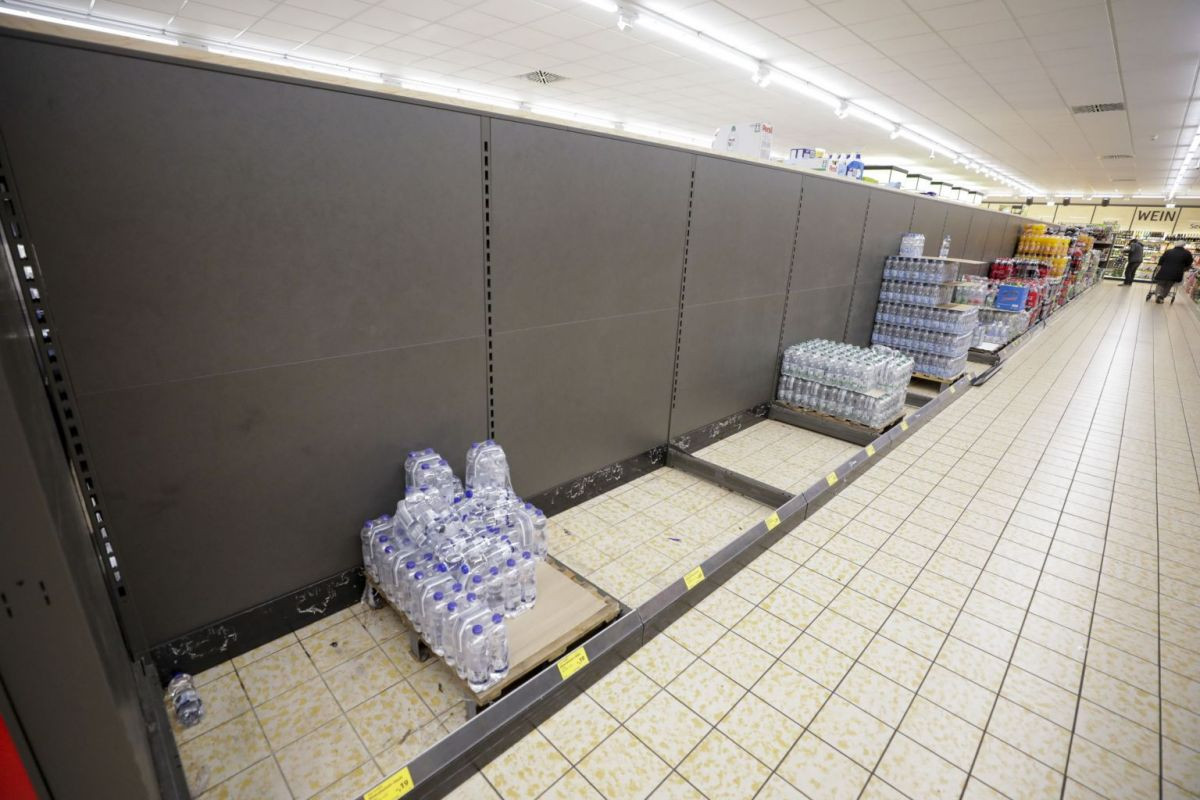 Những lốc nước khoáng hiếm hoi còn sót lại tại siêu thị Aldi (thành phố Hanau, Đức) hôm 2/3. Ảnh: Bloomberg