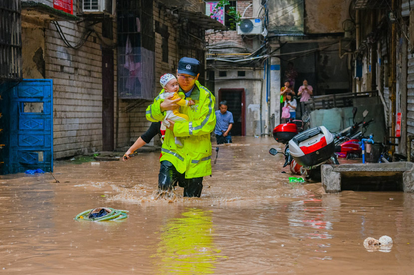 Chính quyền địa phương đã phải sơ tán gần 500.000 người tại 26 quân, huyện gần lưu vực sông Dương Tử.  Ảnh: Chen Xingyu, một sĩ quan cảnh sát giải cứu một em bé từ một khu phố bị ngập lụt.