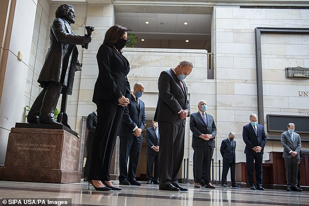 Học tập hành động của Thượng nghị sĩ New Jersey – Cory Booker, các nghị sĩ đảng Dân chủ hôm qua, 4/6 đã quỳ gối suốt 8 phút 46 giây trước toà nhà Quốc hội để tưởng niệm nạn nhân da màu George Floyd.