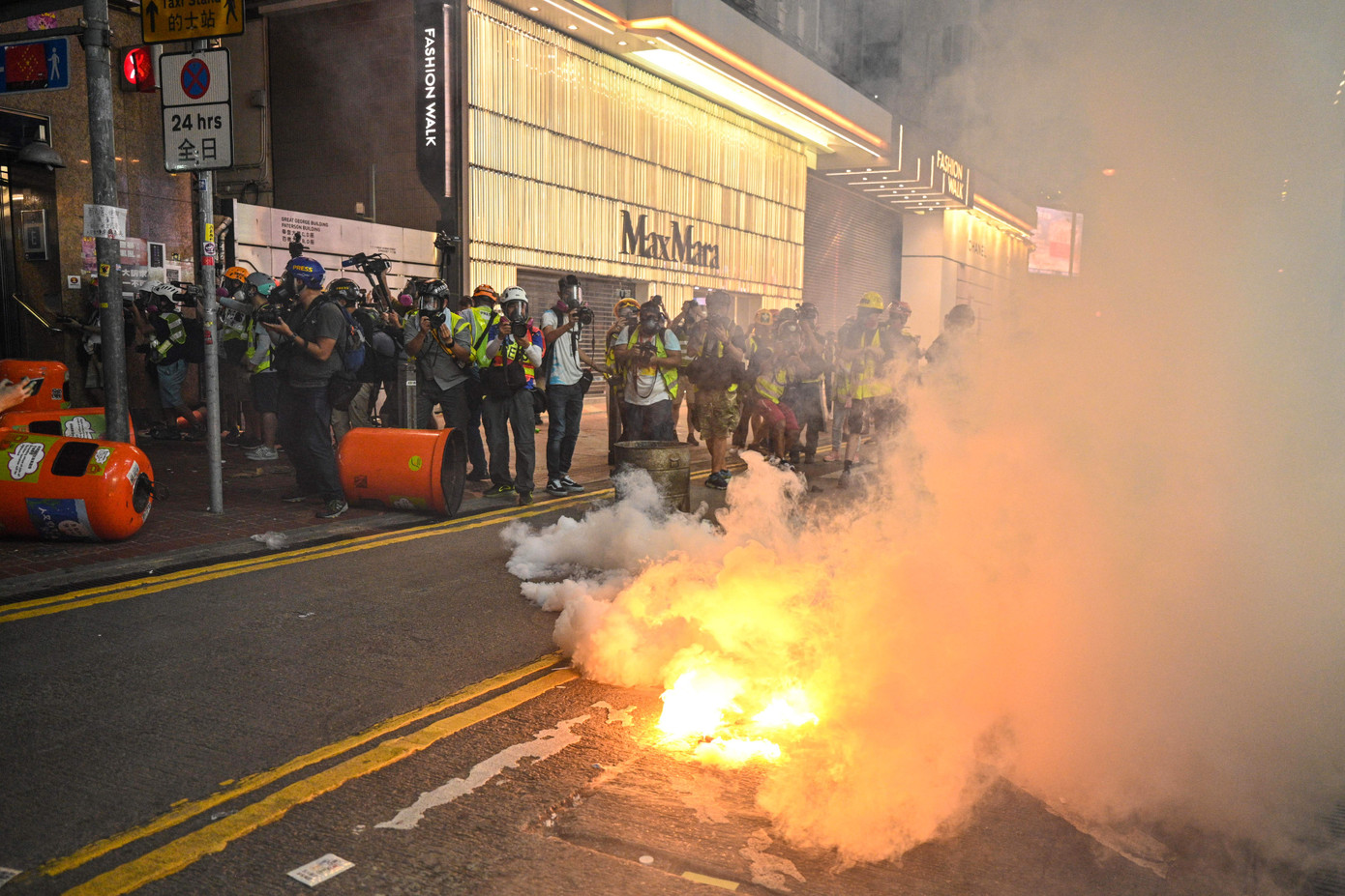Cảnh sát Hong Kong bắn lựu đạn cay ở nhiều địa điểm nhằm giải tán đám đông biểu tình trái phép. Họ cũng phun nước áp lực cao pha thuốc nhuộm màu xanh vào người biểu tình để đánh dấu họ (thuận tiện cho việc bắt giữ sau này). Người biểu tình dùng ô để che dòng nước cực mạnh.