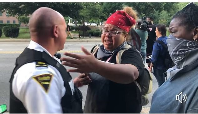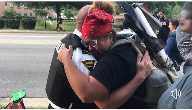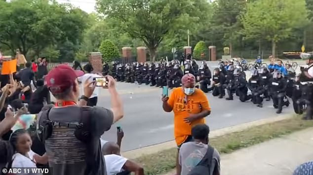 Theo Daily Mail, cảnh tượng cảm động này được ghi lại hôm thứ Hai, 1/6, tại Fayetteville (bang Bắc Carolina), khi những người biểu tình đối đầu một nhóm cảnh sát trên đường Murchison.