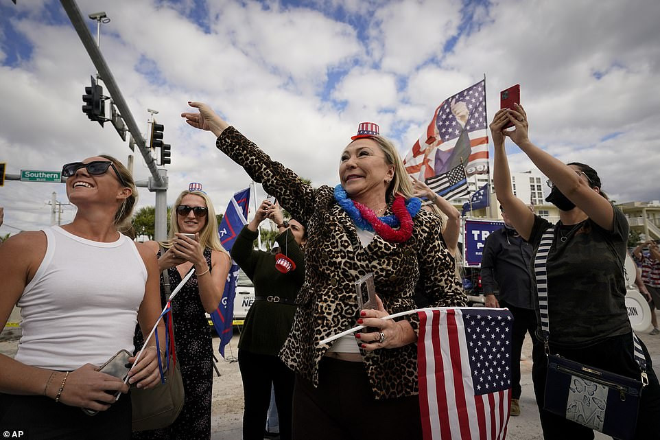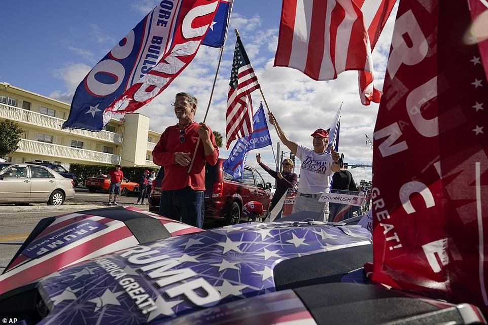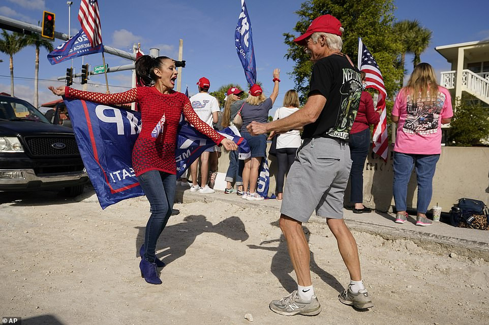 Đám đông – hầu hết không đeo khẩu trang – đã nhảy múa, cười nói và ôm nhau chia vui khi chờ máy bay của ông Donald Trump hạ cánh xuống bang Florida. Ảnh: AP