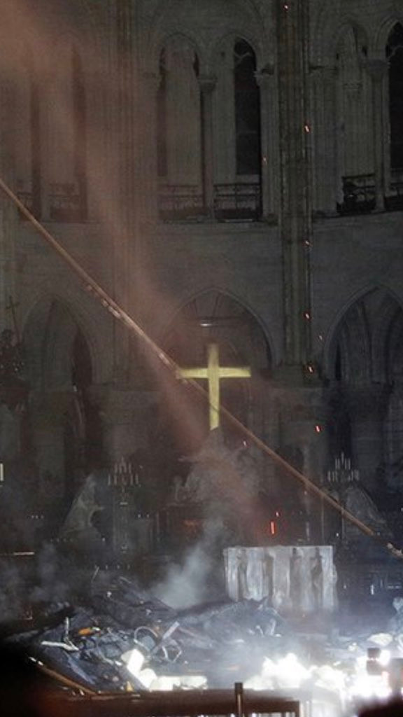 Hình ảnh thập giá vẫn còn nguyên vẹn, rực sáng giữa cảnh hoang tàn tối tăm sau vụ hỏa hoạn. Ảnh: AFP
