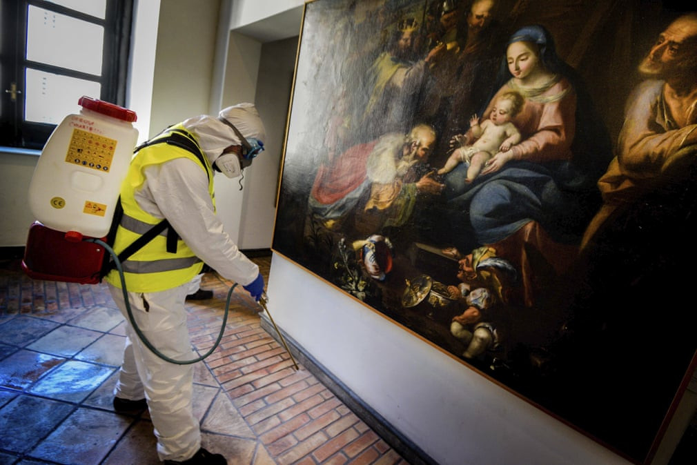 Phun thuốc khử trùng tại một bảo tàng ở Cung điện Maschio Angioino (Naples). Ảnh: AP