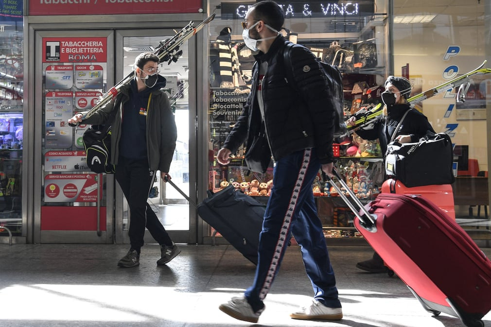 Người dân xách ván trượt tuyết đi giữa ga Turin. Một trong những biện pháp kiểm soát dịch được chính phủ Ý ban hành là đóng cửa các khu nghỉ dưỡng trượt tuyết trên quy mô cả nước. Ảnh: AP