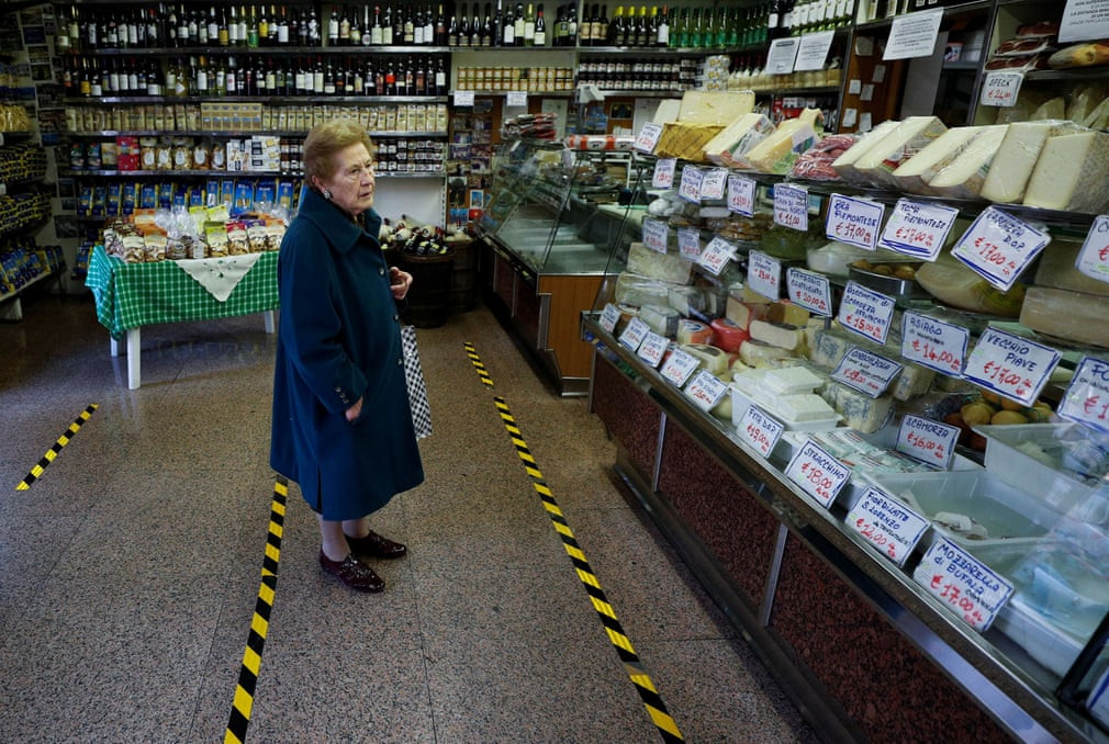 Tiệm tạp hoá ở Trastevere (Rome) dán băng dính đánh dấu khoảng cách an toàn giữa những người mua hàng để tránh lây lan bệnh dịch. Ảnh: Reuters