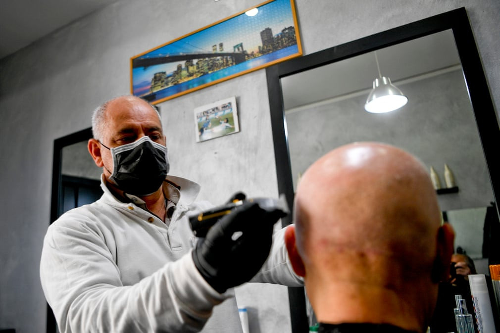 Thợ cắt tóc đeo khẩu trang và găng tay khi làm việc ở Naples. Ảnh: EPA