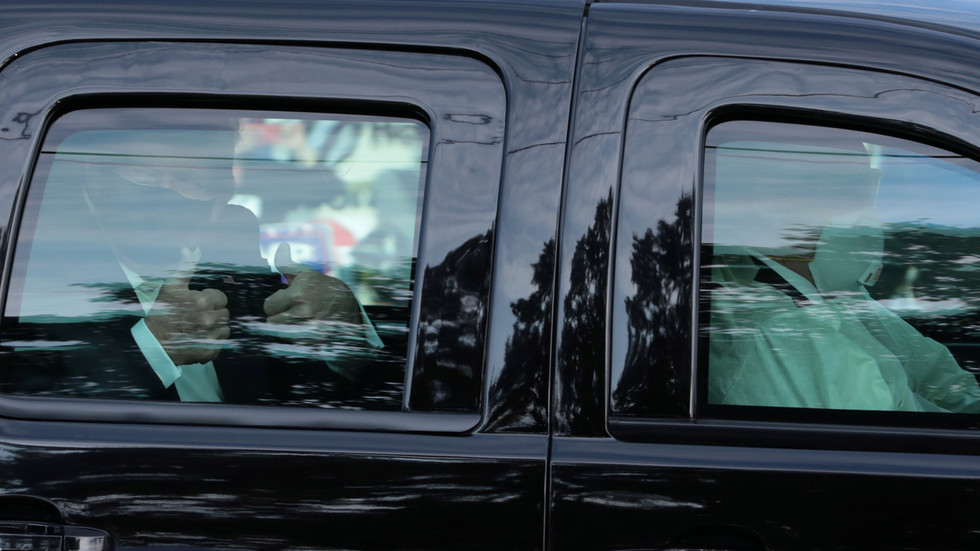 Hình ảnh từ bệnh viện quân y Walter Reed cho thấy ông Trump xuất hiện trên một chiếc Chevrolet Suburban màu đen, đeo khẩu trang và vẫy tay chào đám đông qua cửa kính xe.