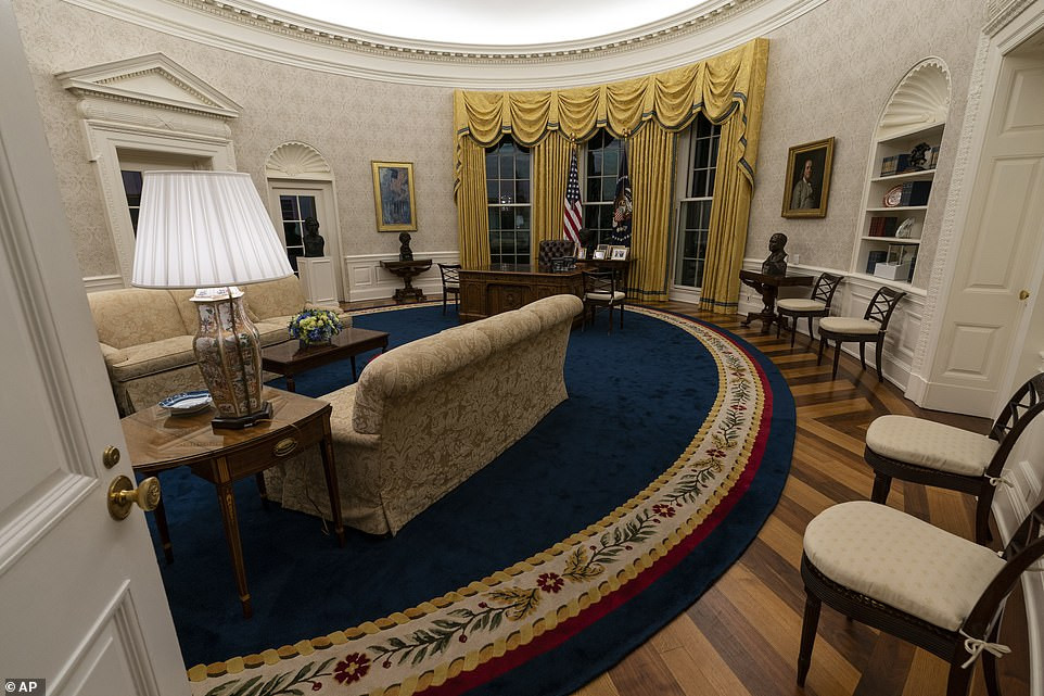 Trong đó, một tấm thảm màu xanh đậm đã được trải xuống sàn phòng Bầu dục, thay cho tấm thảm màu sáng hơn của cựu Tổng thống Donald Trump.
