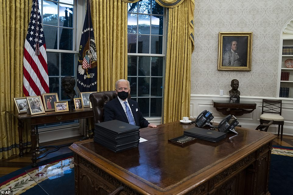 Trên chiếc bàn sau lưng ông Biden có bày một loạt ảnh gia đình, ghi lại khoảnh khắc tân Tổng thống vui đùa cùng con cháu.