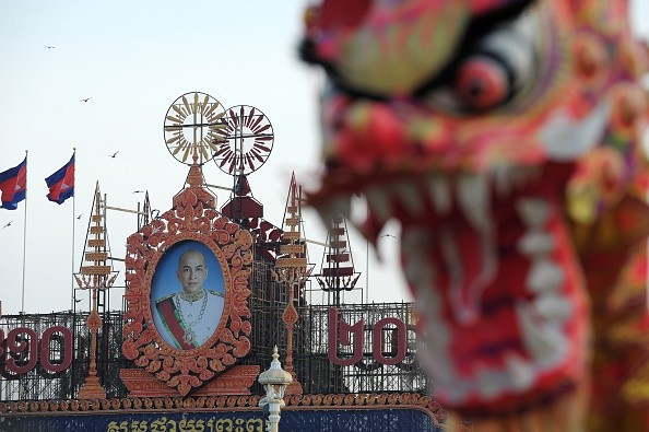 Một nghệ sĩ lân sư rồng biểu diễn ở quảng trường trước cung điện hoàng gia Campuchia, đằng sau là chân dung quốc vương Norodom Sihamoni vào ngày 30 âm lịch.