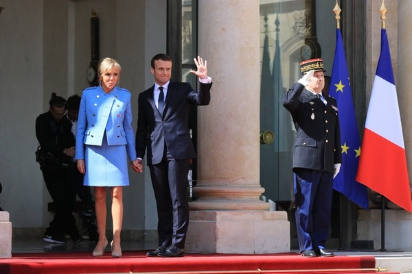 Trong khi đó, Đệ nhất Phu nhân Pháp – bà Brigitte Macron (64 tuổi) xuất hiện tại buổi lễ nhậm chức với bộ trang phục màu xanh sáng của Louis Vuitton. Ảnh: Getty Image