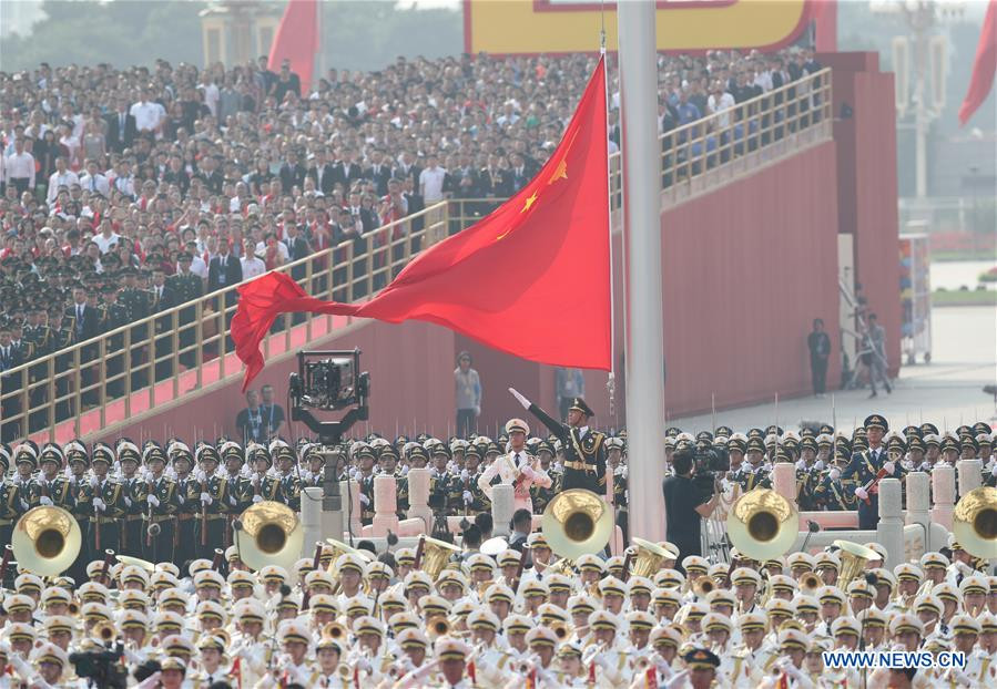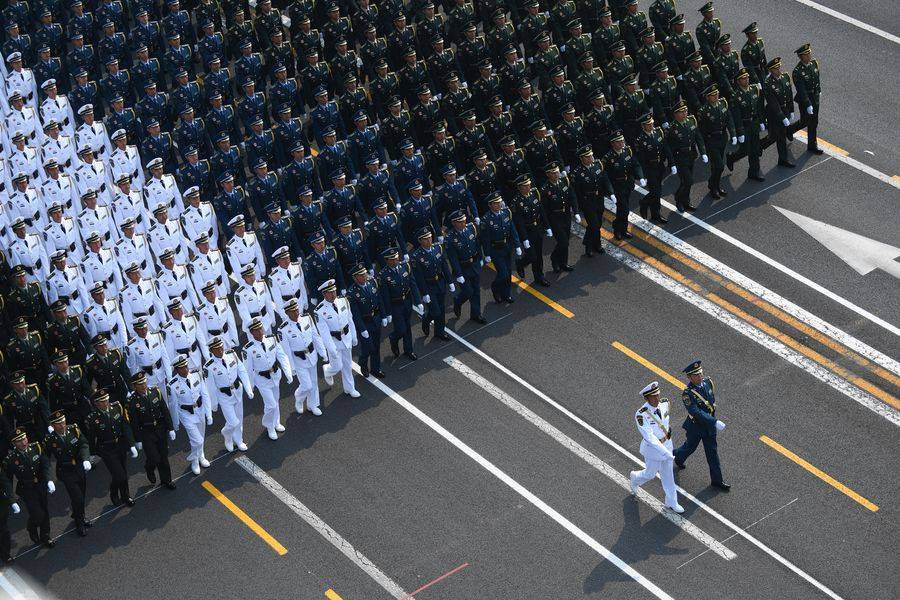 Các đội hình tiêu binh mang quốc kỳ, bộ binh, các đội hình cơ giới và không quân duyệt binh hoặc bay qua vùng trời quảng trường Thiên An Môn. Ảnh: Tân Hoa Xã