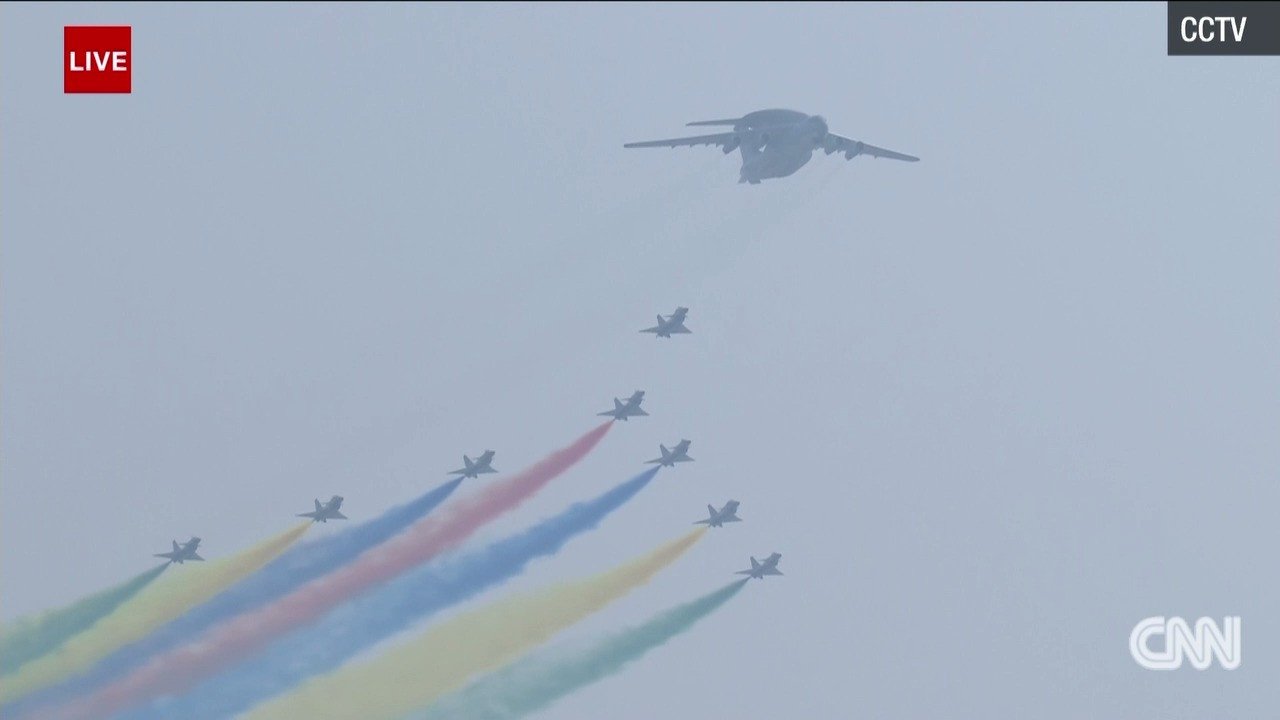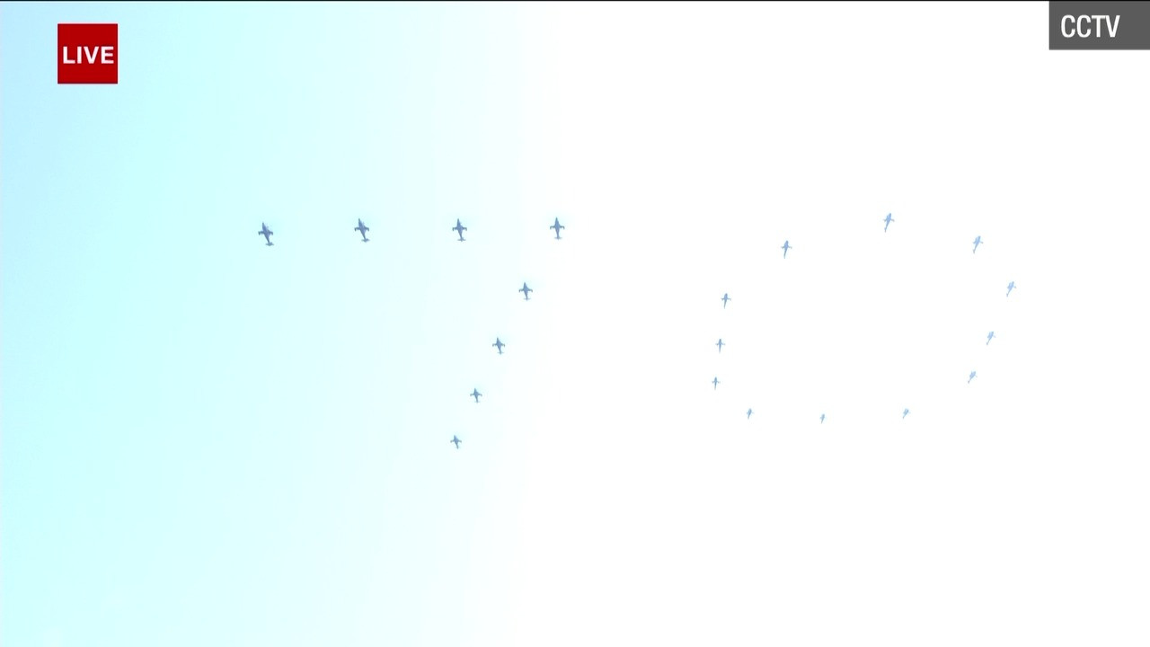 Dàn chiến cơ bay qua quảng trường Thiên An Môn với đội hình số 70. Ảnh: CNN