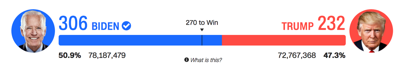 Đáng chú ý, số phiếu đại cử tri của ông Joe Biden bằng với con số 306 phiếu mà Tổng thống Trump giành được trong cuộc bầu cử năm 2016 để đánh bại ứng viên đảng Dân chủ Hillary Clinton. Chiến thắng 4 năm trước được ông Trump mô tả là “long trời lở đất”.