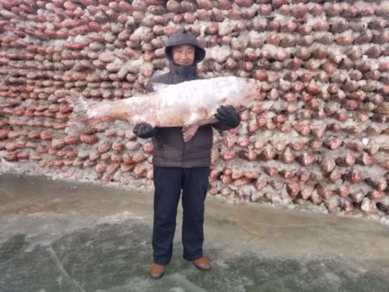 Theo đó, những người ngư dân sẽ cắt các tảng băng dày xung quanh, rồi thả lưới sâu dưới nước, đánh bắt hàng mẻ cá tươi đang mắc kẹt trong băng. Ảnh: JiangsuNow