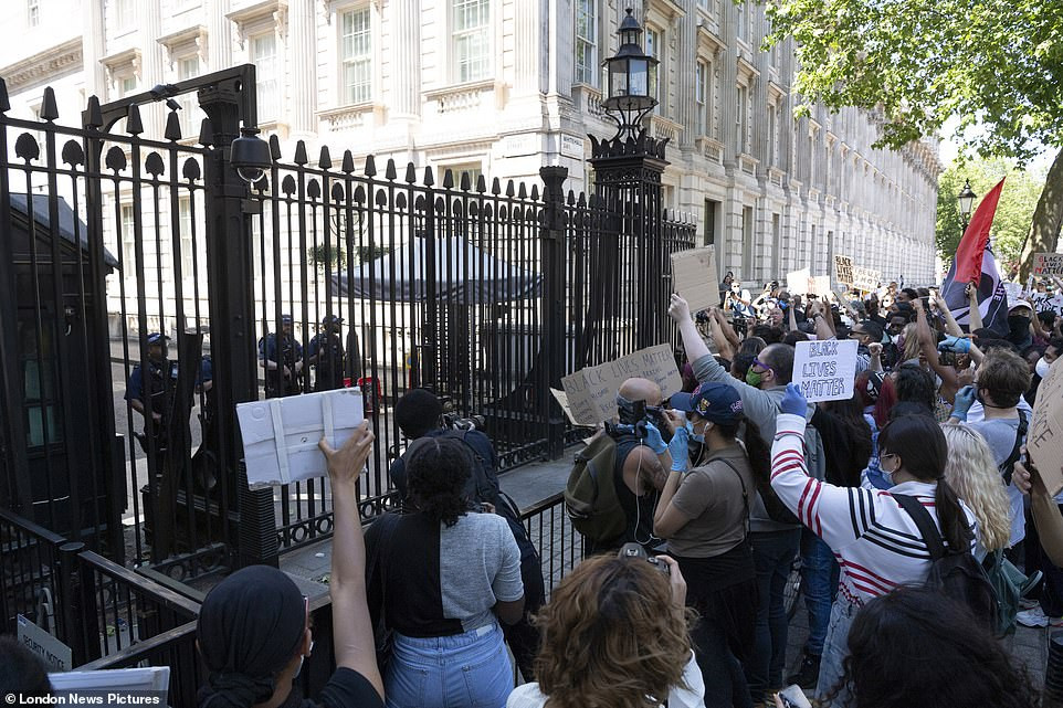 Đám đông hô lớn “Tôi không thở được” (câu nói của George Floyd khi bị cảnh sát khống chế), và lần lượt tiến về phố Downing, Đại sứ quán Mỹ.