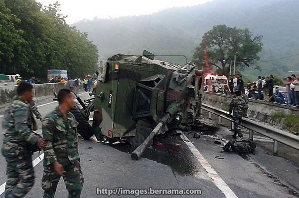 Theo Malaysian insider, vụ tai nạn xảy ra khoảng 18 giờ 30 phút (giờ địa phương). Hai người tử nạn gồm một trung sĩ và một hạ sĩ. Hai người bị thương vẫn đang được điều trị trong bệnh viện.