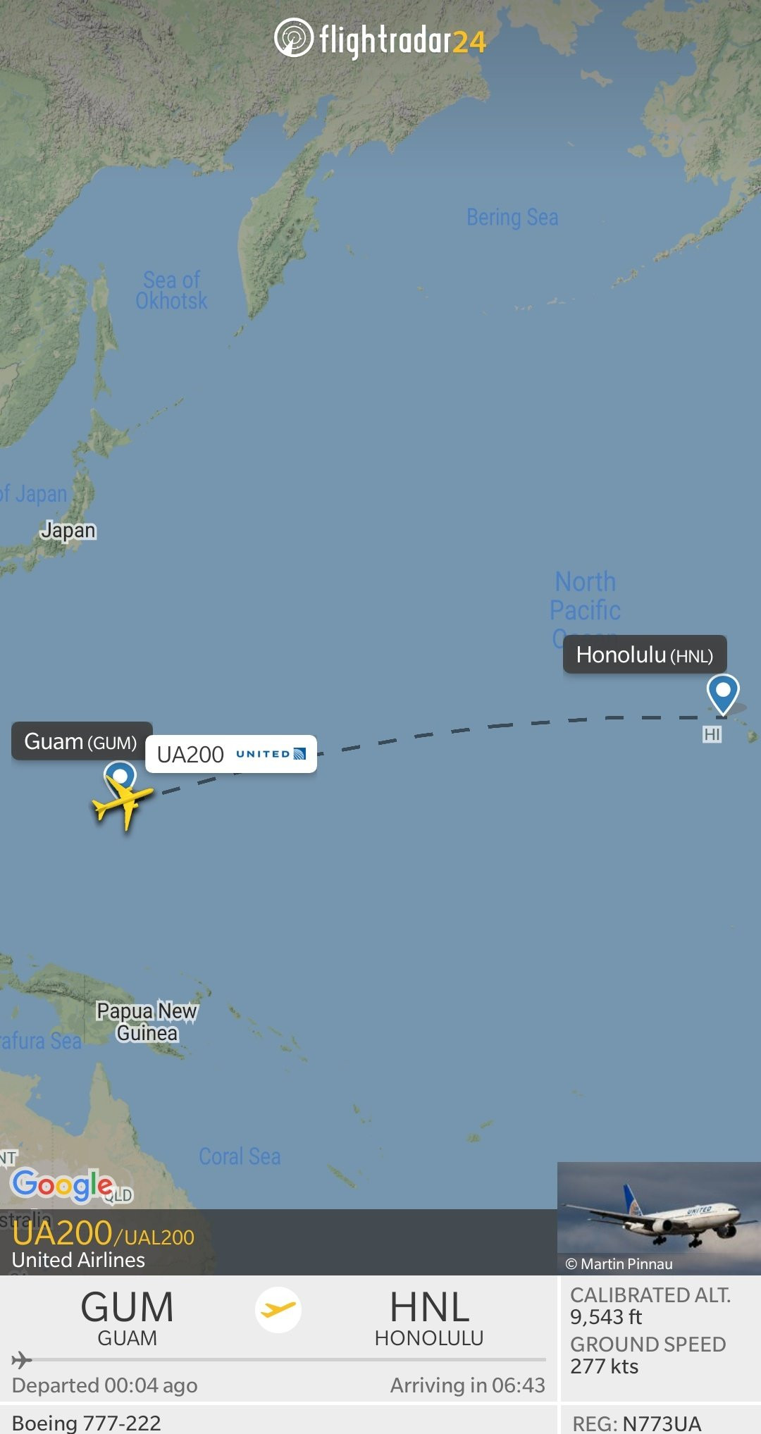Tương tự, chuyến bay mang số hiệu UA200 cất cánh lúc 8h15’ ngày 1/1/2021 từ đảo Guam đã hạ cánh lúc 19h20’ ngày 31/12/2020 tại Honolulu (Hawaii, Mỹ).