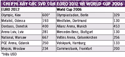 Trung bình, mỗi người dân Ba Lan dù già hay trẻ, dù yêu bóng đá hay không, sẽ phải đóng góp 3.500 USD cho sự kiện này. Không chỉ xây mới, mà họ còn xây mới một cách rất hoành tráng. Chi phí xây dựng sân Olympic ở Kiev, nơi sẽ diễn ra trận chung kết EURO 2012, lên tới 600 triệu USD, gấp rưỡi sân bóng được coi là hiện đại nhất châu Âu hiện nay là Allianz Arena của Đức (nơi diễn ra trận chung kết Champions League 2011/12 giữa Bayern Munich và Chelsea). Sự tốn kém càng rõ ràng hơn khi so sánh với số tiền chưa đến 150 triệu USD mà Áo bỏ ra để nâng cấp... toàn bộ các sân đấu của EURO 2008. Chỉ riêng sân đấu này đã khiến Ukraine lỗ nặng sau EURO 2012.