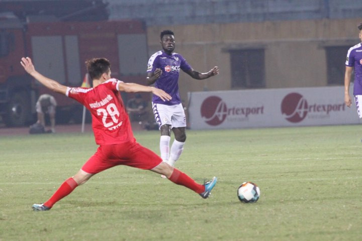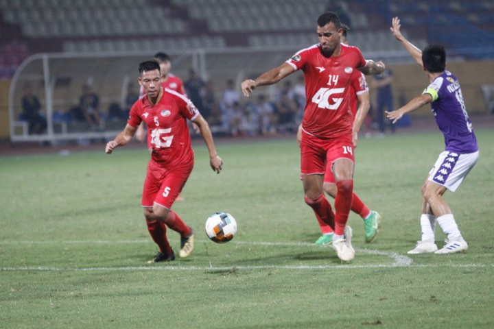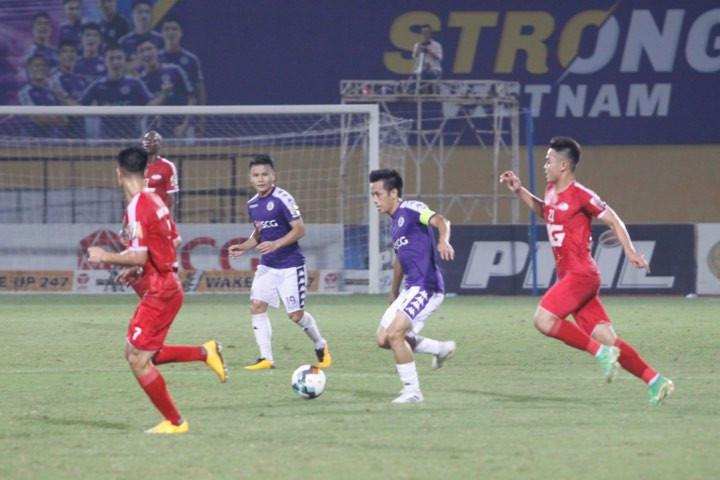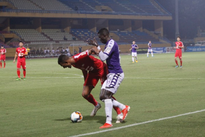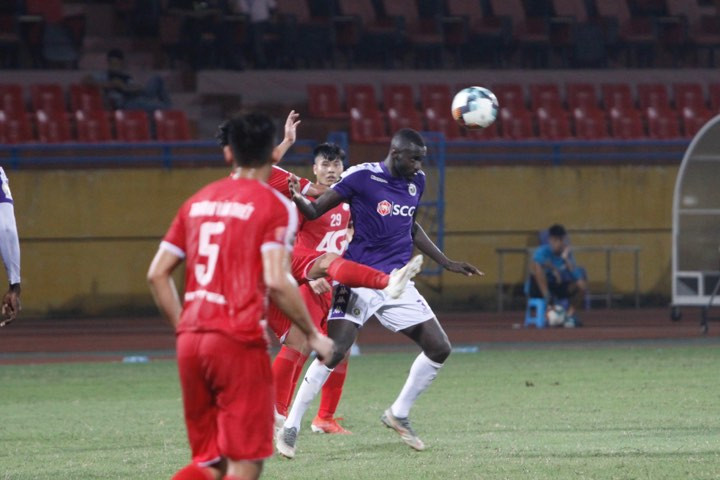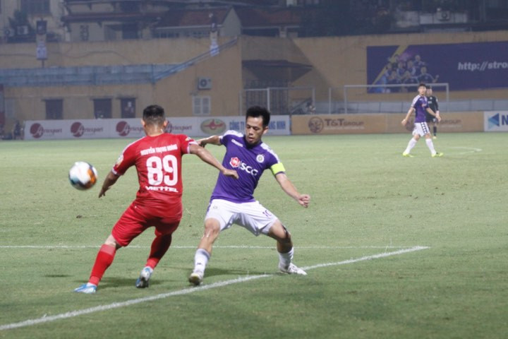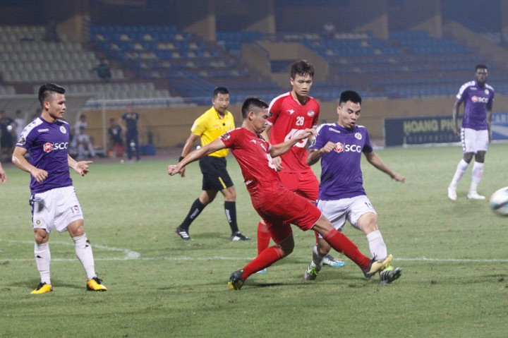 Nhận bàn thua sớm, Hà Nội FC buộc phải đẩy nhanh tốc độ tấn công, nhưng vấp phải hàng phòng ngự số đông của Viettel.