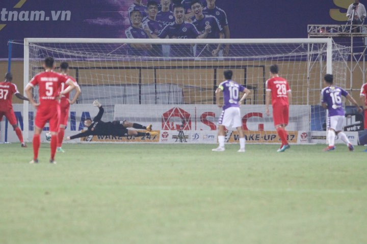 Trước khi hiệp 1 kết thúc, Quang Hải bị Trọng Hoàng phạm lỗi trong vòng cấm Viettel, trọng tài lập tức thổi phạt đền cho Hà Nội FC. Đáng tiếc cho nhà ĐKVĐ khi Pape Omar không thắng được thủ môn Xuân Sơn trên chấm 11m. 45 phút đầu tiên của trận đấu kết thúc với tỷ số 2-0 nghiêng về phía đội khách Viettel.
