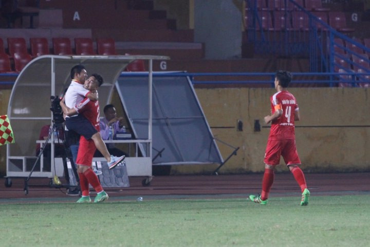 Phút 49, Quang Hải đá phạt góc chuẩn xác để Thành Chung rút ngắn tỷ số xuống 1-2 cho đội bóng Thủ đô.