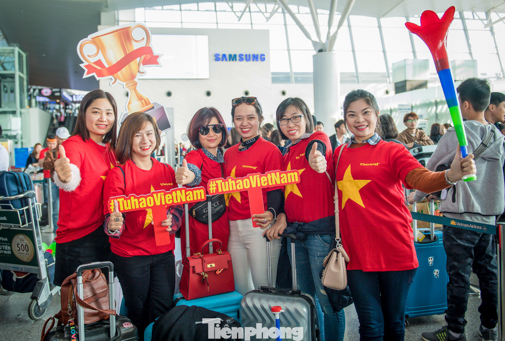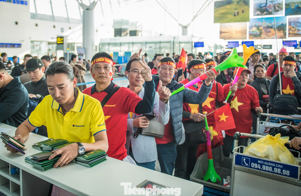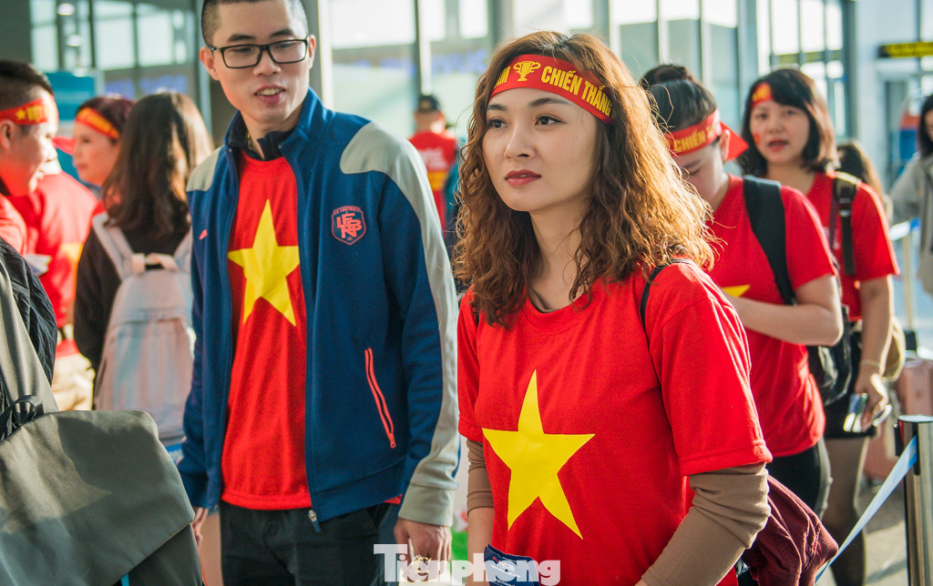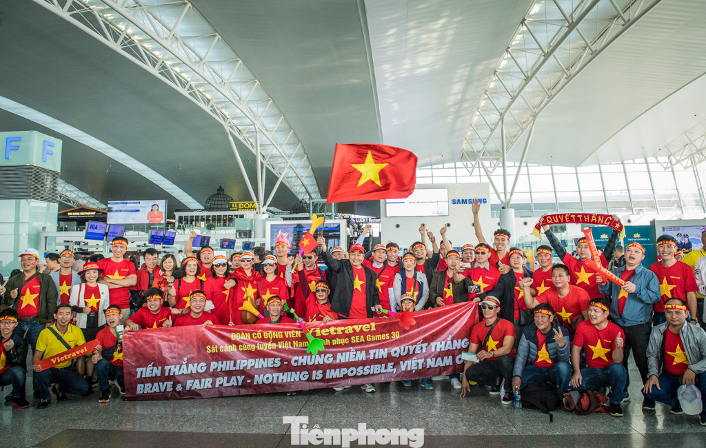 Hàng ngàn CĐV có mặt tại khu vực check-in sân bay quốc tế Nội Bài (Hà Nội) vào sáng nay để lên đường sang thủ đô Manila (Philippines) "tiếp lửa" cho U22 Việt nam quyết đấu với U22 Indonesia giành HCV SEA Games 30.