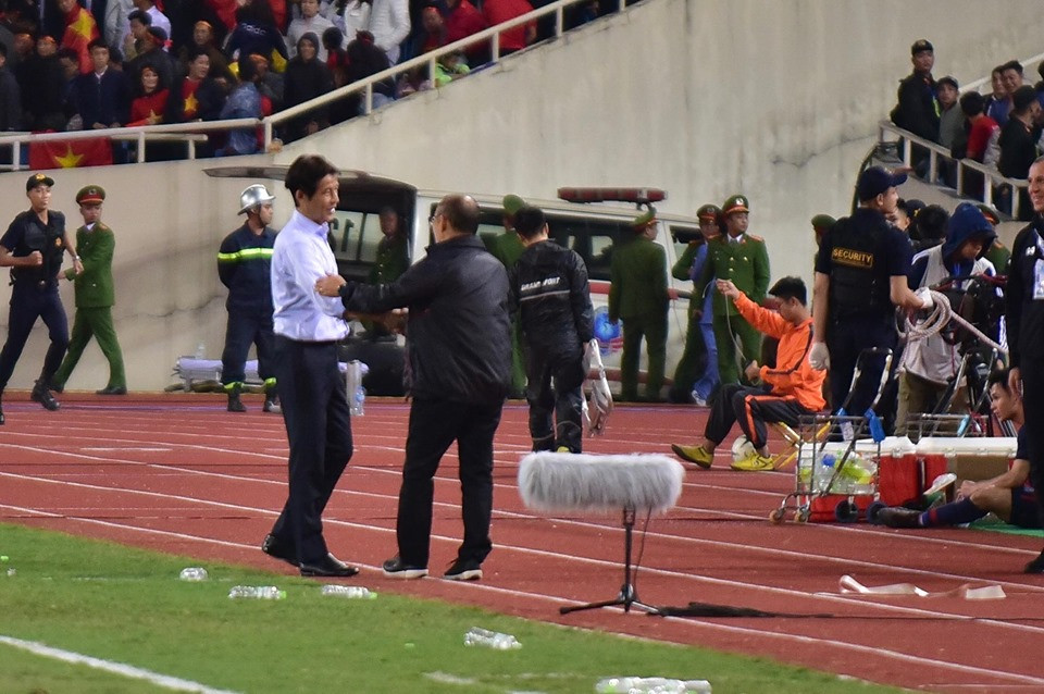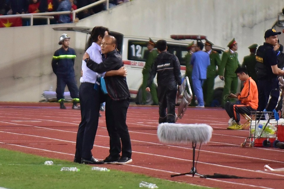 Vừa hết trận đấu giữa Việt Nam và Thái Lan, HLV Park Hang Seo đã có cử chỉ hữu nghị. Ông sang bên khu vực kỹ thuật của tuyển Thái Lan để bắt tay đồng nghiệp Akira Nishino.
