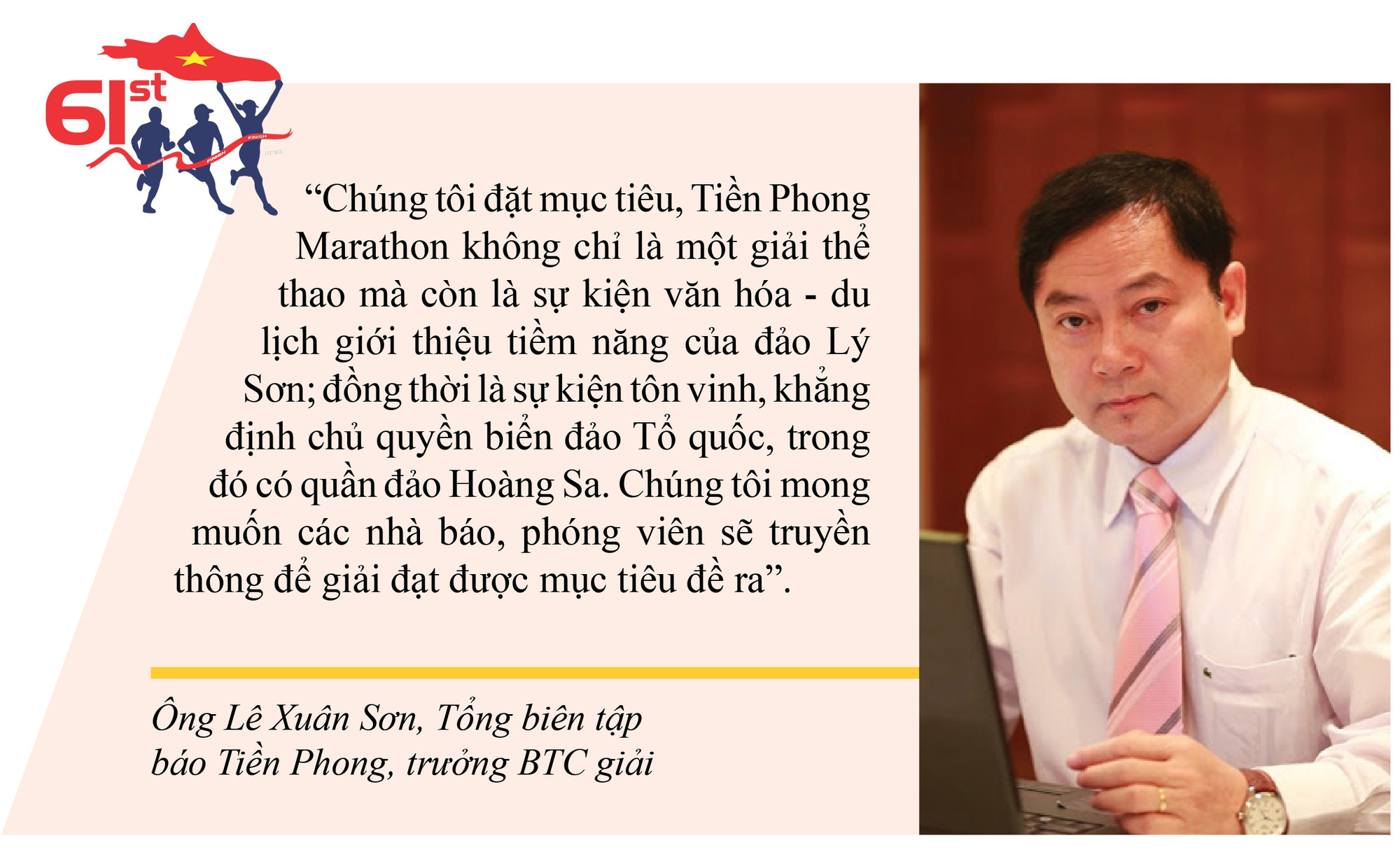 Ông Lê Xuân Sơn, Tổng biên tập báo Tiền Phong, trưởng BTC giải nhấn mạnh: "Chúng tôi đặt mục tiêu, Tiền Phong Marathon không chỉ là một giải thể thao mà còn là sự kiện văn hóa - du lịch giới thiệu tiềm năng của đảo Lý Sơn; đồng thời là sự kiện tôn vinh, khẳng định chủ quyền biển đảo Tổ quốc, trong đó có quần đảo Hoàng Sa. Chúng tôi mong muốn các nhà báo, phóng viên sẽ truyền thông để giải đạt được mục tiêu đề ra". Nhà báo Lê Xuân Sơn cho biết thêm, giải Vô địch Quốc gia Marathon và cự ly dài báo Tiền Phong tổ chức ở đảo do đó kinh phí tổ chức cao. Sự quan tâm của tỉnh Quảng Ngãi và sự ủng hộ nhiệt tình của các nhà tài trợ đã giúp ban tổ chức vững tâm tổ chức giải đúng quy mô, trình độ và sự lan tỏa cần phải có.