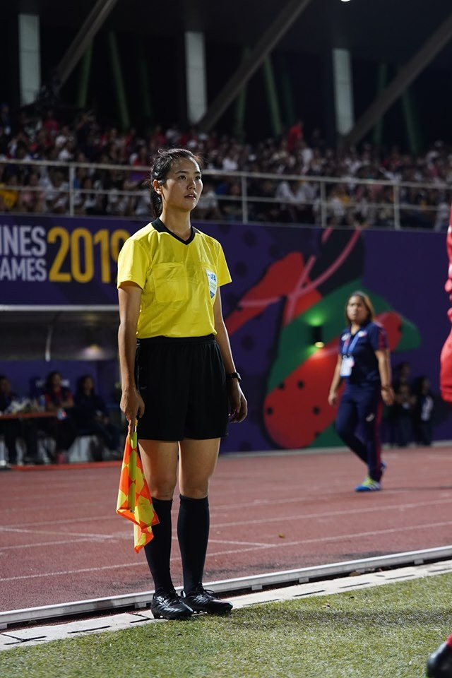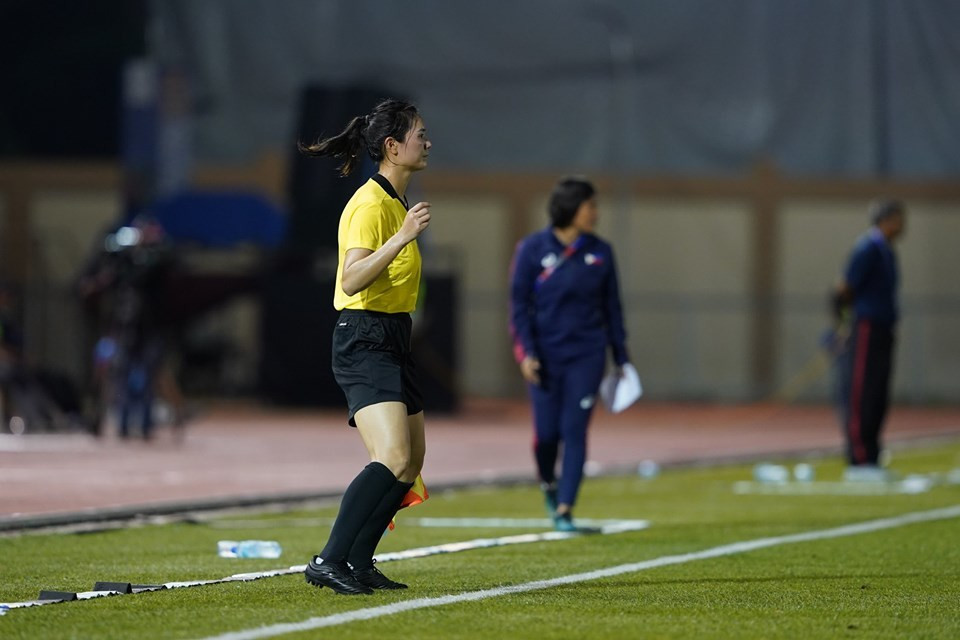 Nữ trọng tài Xie Lijun là người phất cờ báo việt vị sau khi cầu thủ Philippines Del Ocampo đánh đầu tung lưới Kim Thanh phút 73.