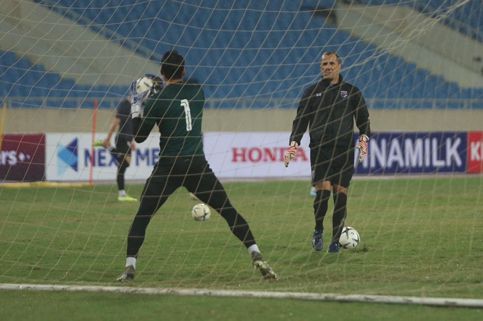 Các thủ môn của tuyển Thái Lan tập riêng tại khu vực cầu môn và họ cũng gặp khó khăn trong điều kiện mưa lớn.