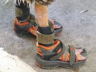 Từ khi có đôi xăng - đan, ngỗng Gator thường xuyên được ông bà chủ đưa đi dạo. Chú cũng tỏ ra khá “tự tin” khi diện xăng - đan đi lang thang trong sân để kiếm mồi.