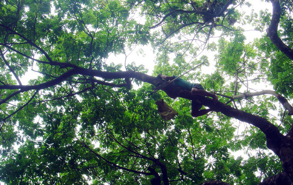 | Vắt vẻo trên cây cao chót vót để hái sấu. |