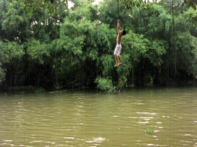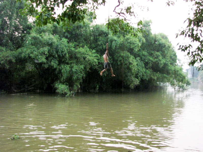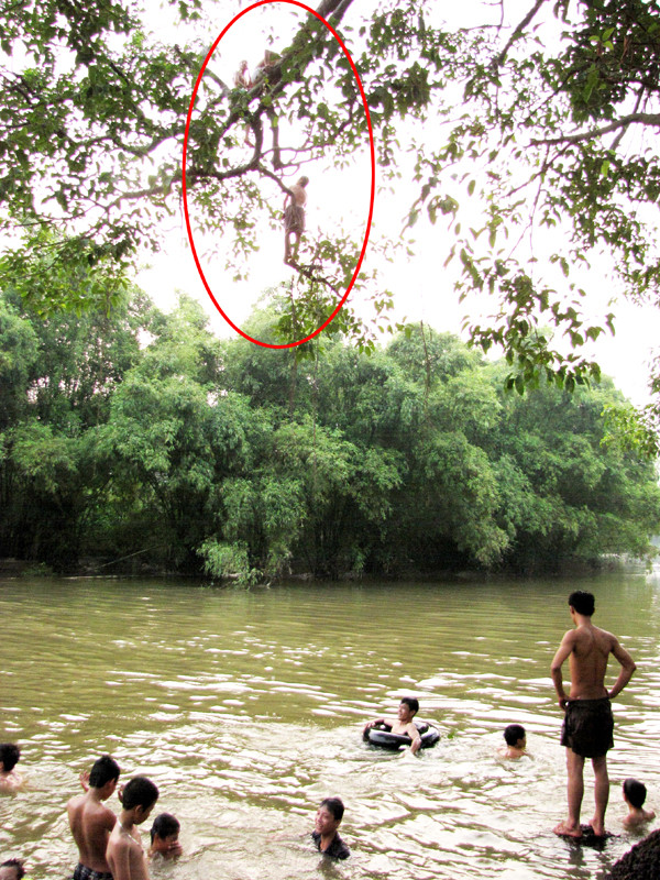 Hằng ngày, cứ khoảng 4h chiều, hàng chục thanh thiếu niên ở xóm Chiền (xã Kim Quan, huyện Thạch Thất, Hà Nội) rủ nhau tắm ở dòng sông Tích. Nhiều em leo lên ngọn cây đa, thành cầu cao hơn 20m để thử cảm giác mạnh bằng các pha nhào lộn, thả người xuống dòng sông. Nhiều người không khỏi thót tim khi chứng kiến những cảnh tượng này.