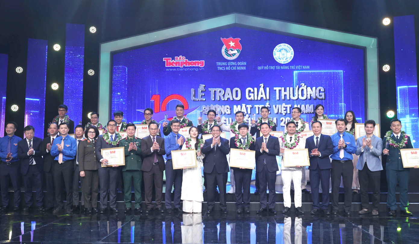 | Thủ tướng Chính phủ Phạm Minh Chính và Bí thư thứ nhất Trung ương Đoàn Bùi Quang Huy tặng thưởng 10 Gương mặt trẻ Việt Nam tiêu biểu năm 2024. |